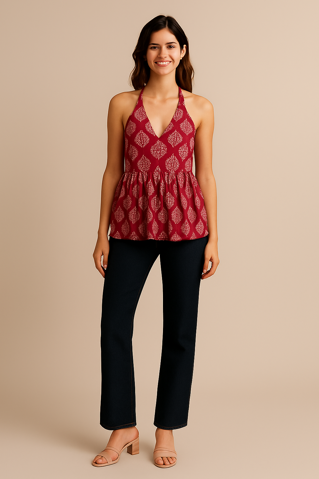 Turn heads effortlessly with the Evanya Tunic, crafted from soft cotton for breathable comfort all day long. Featuring a sleeveless halter-neck design with a tie-up back and a flared silhouette, this tunic blends playful style with timeless elegance. The bold red base with white ethnic block prints adds a vibrant touch, making it perfect for both festive gatherings and casual chic outings.